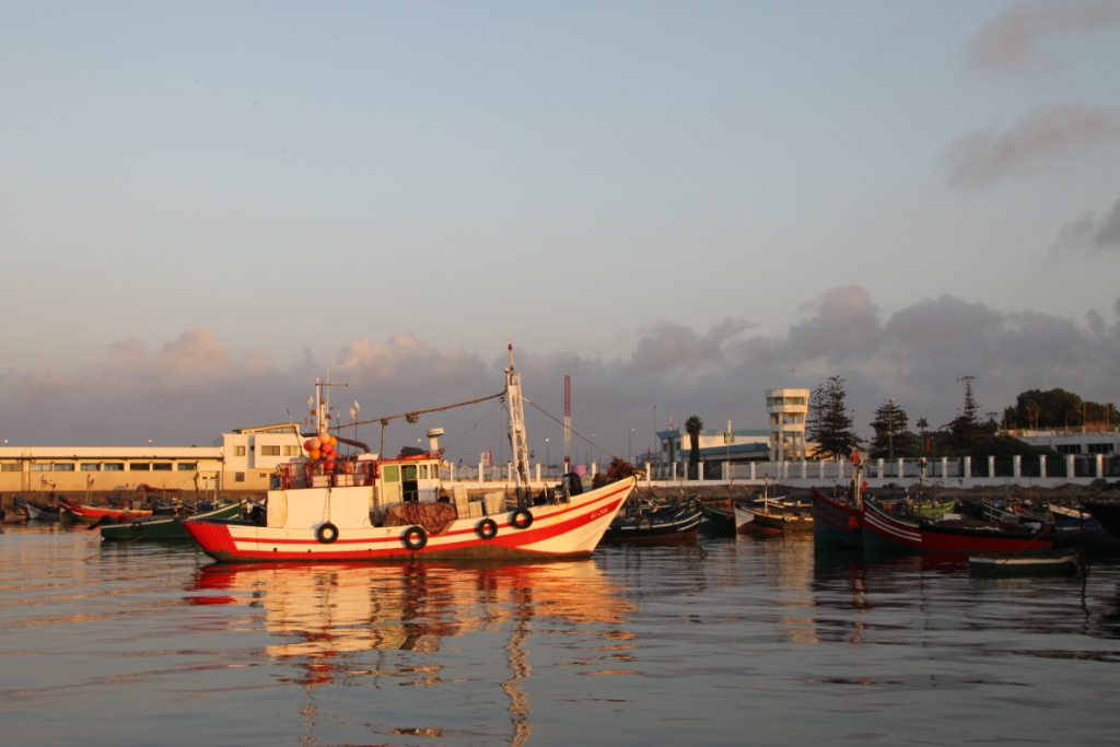 Nattens seilas bar preg av skarpt utkikk etter lokale fiskebåter og garn i vannet som var merket med små diodelys. Etter det ble lyst igjen var det flere fiskebåter som gikk vel nært oss når de passerte. En båt ville selge oss blekksprut men vi takket nei. Seilbåten Oojah med Christine og Peter møtte vi igjen i Essaouira. De fortalte at flere båter kom opp på siden av dem og ville ha tobakk og alkohol. Vi ankom havna kl 19 rett etter solnedgang, og lå utenpå Oojah som 4 seilbåt i rekke. Og da var det ikke plass til flere her. Havna luktet råtten fisk, skittent vann, enormt med måse og det var travel aktivitet med lossing av fisk og klargjøring av garn. Samt badende gutter i det skitne vannet i havnebassenget. Fisken losses og legges på is i kasser for hånd, og det var nok flere hundre mennesker i jobb store deler av døgnet.