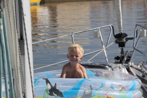 Dagen etter dro Oojah og en tysk seilbåt som lå innerst videre. Vi bestemte oss for å dra inn båtene med tau fra flytebrygga etter at den innerste båten hadde lirket seg ut. Men etter iherdig draing innså vi at båtene ikke kom nærmere brygga. Vi oppdaget da at havna som skal være 3 meter dyp nå på fjære sjø var 1.7m. Og vi stikker jo 2.1 meter. Mye fiskslo og annet i vannet her altså 🙂 Så det var bare å vente på flo sjø for å komme nærmere brygga.